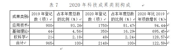 三大成果類別所占比例與去年相比,2020年度登記的應(yīng)用技術(shù)類成果1750項(xiàng),增長(zhǎng)了94.44%;基礎(chǔ)理論類成果350項(xiàng),增長(zhǎng)了695.45%;軟科學(xué)類成果48項(xiàng),增長(zhǎng)了128.57%。