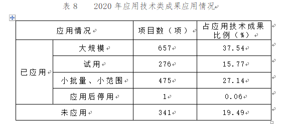 在已應(yīng)用的成果中,大規(guī)模應(yīng)用的657項(xiàng),占本年度應(yīng)用技術(shù)類成果的37.54%;試用的276項(xiàng),占15.77%;小批量、小規(guī)模應(yīng)用的475項(xiàng),占27.14% ;應(yīng)用后停用的1項(xiàng)。