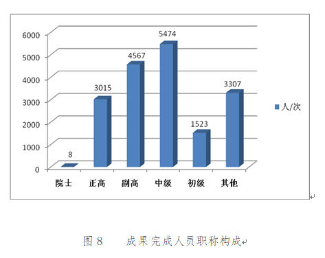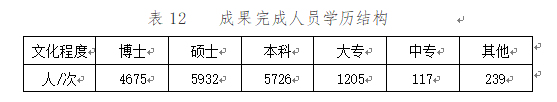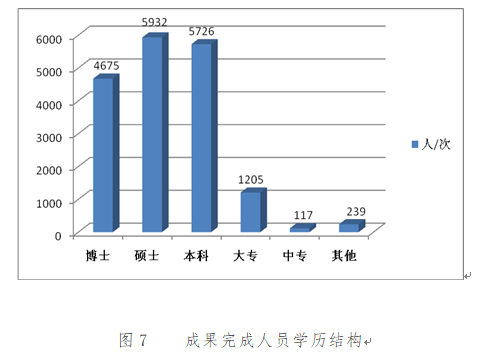 博士、碩士研究生10607人/次,占本年度成果完成人員總數(shù)的 59.28%;大學(xué)本科生 5726人/次,占本年度成果完成人員總數(shù)的 32%。