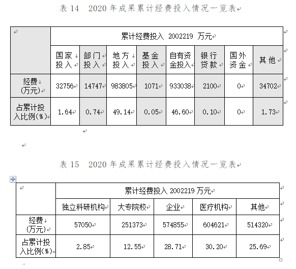 注:科技成果的經(jīng)費(fèi)投入是指科技成果在研究、開發(fā)、應(yīng)用和推廣過程中實(shí)際投入的全部資金。由于科技成果從投入研究到形成成果歷時(shí)數(shù)年,且研究時(shí)間跨度不等,所以以上數(shù)據(jù)反映的不是當(dāng)年經(jīng)費(fèi)投入情況,而是2020年度登記的科技成果某階段經(jīng)費(fèi)投入情況。
