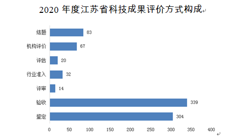 2020年度江蘇科技成果評價仍然以鑒定與驗收為主,其他為輔助模式。其中,鑒定項目304項,占總量的35%;驗收項目339項,占總量的39%;評審項目14項;行業(yè)準入項目為32項;評估項目為20項;機構評價項目為67項;結題項目83項。