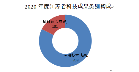 2020年江蘇科技成果類別仍然以應用技術成果為主,共計708項,占82%;基礎理論成果151項,占18%。