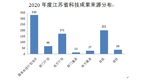 2020年江蘇省科技成果登記總數中,課題來源于國家科技計劃項目330項,比上一年度增長38%,其中:科技重大專項16項,自然科學基金171項,高技術發(fā)展研究計劃1項,其他125項。課題來源除了國家科技計劃外,部門計劃66項,地方計劃171項,部門基金13項,地方基金27項,國際合作2項,橫向委托12項,自選201項,其他36項。