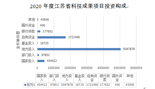 2020年江蘇科技成果經費實際投入總額為7540337萬元,其中,國家投入434412萬元,占6%;部門投入97852萬元,地方投入5047878萬元,占67%;基金投入16725萬元,自有資金1721466萬元,占23%;銀行貸款177632萬元;國外資金436萬元;其他43936萬元。