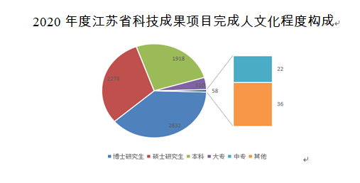 2020年江蘇科技成果完成人的文化程度博士研究生人數首次占據第一,標志著我省科技人才層次正不斷攀升,碩士研究生學歷以上的完成人占總完成人數的69%:博士研究生2832人次,碩士研究生2278人次,大學本科1918人次,此外,大專310人次,中專22人次,其他36人次。