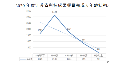 2020年江蘇科技成果完成人的年齡結構依舊以55歲以下為主,其中36-45周歲的成為完成人的主力軍:35歲以下(含35歲)1621人次,占總數的22%;36-45歲3138人次,占總數的42%;46-55歲1734人次,占總數的23%;56-65歲811人次,占總數的11%;65歲以上的92人次。