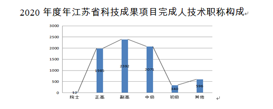 2020年江蘇科技成果完成人的技術職稱構成以中高級以上為主:院士12人;正高1985人,副高2392人,中級2071人,初級340人,其他596人次。2020年度江蘇科技城成果完成人的技術職稱構成與上一年度保持平衡。