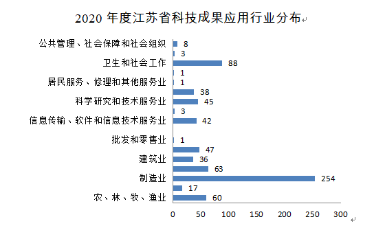 2020年江蘇科技成果應用行業(yè)涉及17個方面,農、林、牧、漁業(yè)60項,采礦業(yè)17項,制造業(yè)254項,電力、熱力、燃氣及水的生產和供應業(yè)63項,建筑業(yè)36項,批發(fā)與零售業(yè)1項,交通運輸、倉儲和郵政業(yè)47項,信息傳輸、軟件和信息技術服務業(yè)42項,金融業(yè)3項,房地產業(yè)1項,科學研究和技術服務業(yè)45項,水利、環(huán)境和公共設施管理業(yè)38項,居民服務、修理和其他服務業(yè)1項,教育1項,衛(wèi)生和社會工作88項,文化、體育和娛樂業(yè)3項,公共管理、社會保障和社會組織8項。