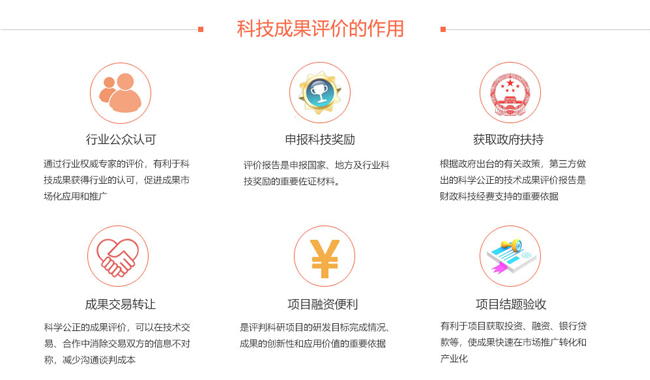 科技成果評價的作用:1、行業(yè)公眾認可;通過行業(yè)權(quán)威專家的評價,有利于科技成果獲得行業(yè)的認可,促進成果市場化應(yīng)用和推廣。2、申報科技獎勵;評價報告是申報國家、地方及行業(yè)科技獎勵的重要佐證材料。3、獲取政府扶持;根據(jù)政府出臺的有關(guān)政策,第三方做出科學(xué)公正的技術(shù)成果評價報告是財政科技經(jīng)費支持的重要依據(jù)。4、成果交易轉(zhuǎn)讓;科學(xué)公正的成果評價,可以在技術(shù)交易、合作中消除雙方的信息不對稱,減少溝通談判成本。5、項目融資便利;是評判科研項目的研發(fā)目標完成情況成果創(chuàng)新性和應(yīng)用價值的重要依據(jù)。6、項目結(jié)題驗收;有利于項目獲取投資、融資、銀行貸款等,使成果快速在市場推廣轉(zhuǎn)化和產(chǎn)業(yè)化。