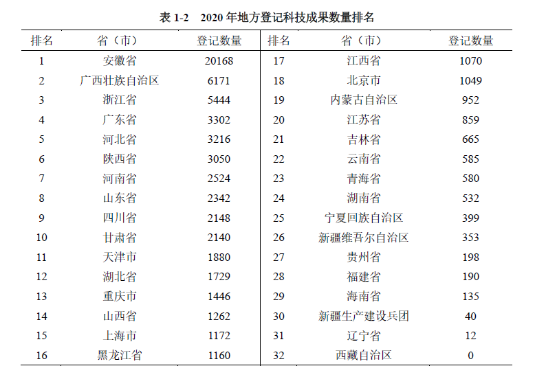 地方登記科技成果共70063項,占全國登記科技成果總量的91.56%,同比增長13.86%。安徽省、廣西壯族自治區(qū)、浙江省等地方登記成果數(shù)量居地方登記省份前列(見表1-2)。