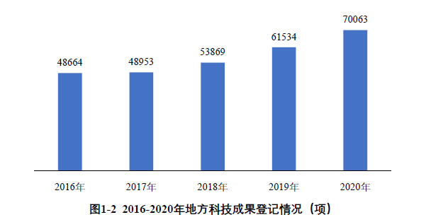 2016-2020年,地方登記的科技成果總量呈逐年增長趨勢,2020年相比于2016年增長了43.97%(見圖1-2)。