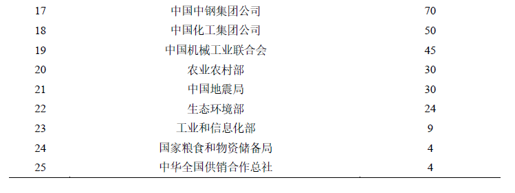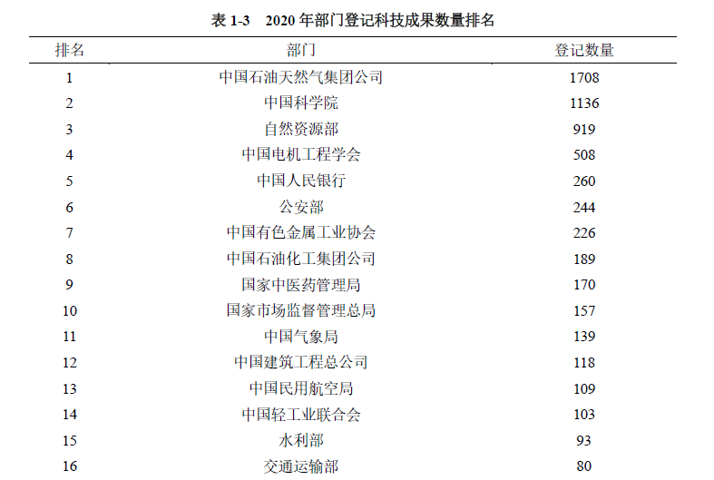 國務院有關部門、行業(yè)協(xié)會、中央企業(yè)登記科技成果數(shù)量為6458項(2019年7028項),同比下降8.11%,占全國登記科技成果總量的8.44%。中國石油天然氣集團公司、中國科學院、自然資源部等部門的登記成果數(shù)量居部門登記單位前列(見表1-3)。
