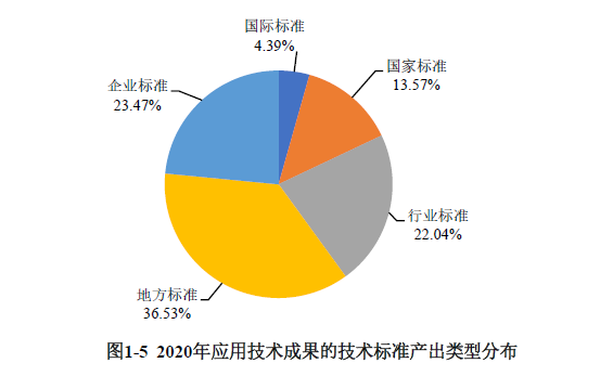 技術標準的構成保持穩(wěn)定。2020年登記的67108項應用技術成果中,共制定技術標準980項,較上年略有減少,但技術標準的構成比例較上年基本一致。其中,地方技術標準最為突出,占比36.53%;企業(yè)技術標準占比23.47%;國際技術標準占比最低,為4.39%(見圖1-5)。