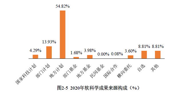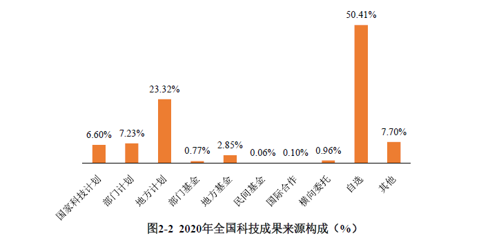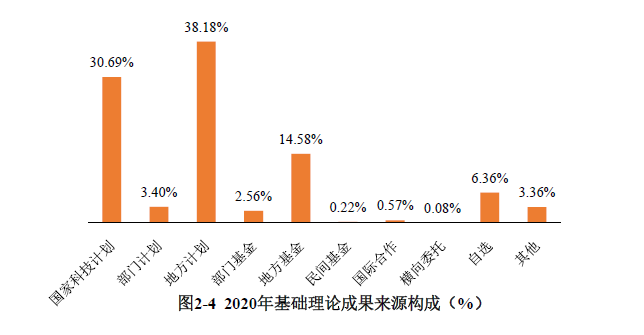 基礎理論成果的主要來源仍以科技計劃項目為主,占比總和達到71.27%。其中,來自國家科技計劃的科技成果比例達到30.69%,來自地方計劃的科技成果比例達到38.18%(見圖2-4)。