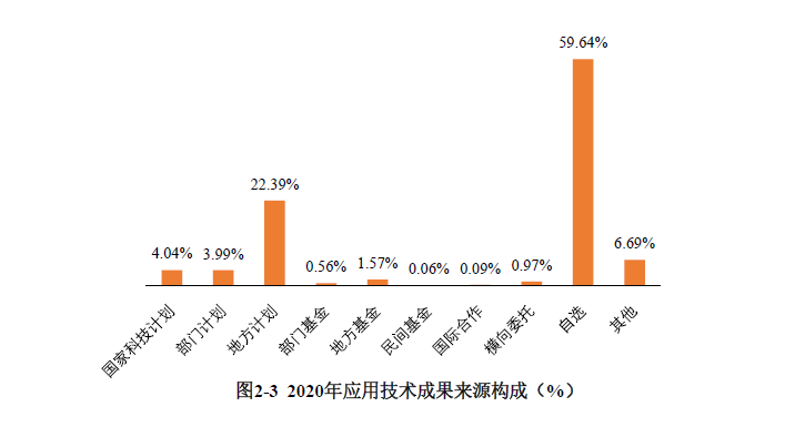 應用技術成果主要來自于自選課題。全國登記的應用技術成果來自自選課題的比例占登記應用技術成果的59.64%;地方計劃占比為22.39%;來自于國家科技計劃、部門計劃的應用技術成果分別占4.04%和3.99%(見圖2-3)。