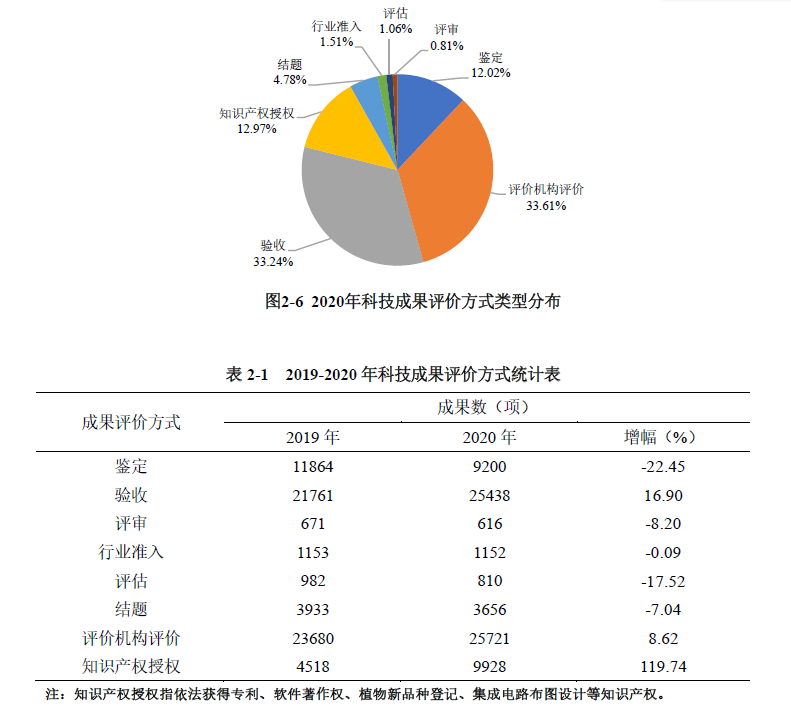 科技成果評價方式主要以機構評價和驗收方式為主。由評價機構進行評價的科技成果占比達到33.61%,以驗收方式完成的科技成果占比為33.24%。以知識產權授權方式完成的科技成果數為9928項,占比達到12.97%,較上年明顯增加,增幅達到119.74%(見圖2-6、表2-1)。