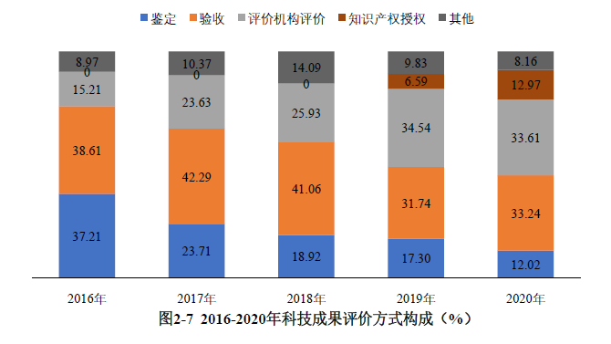 2016-2020年,科技成果的評價方式發(fā)生重大轉變,機構評價方式逐漸成為主流,通過機構評價方式登記的科技成果占比從2016年的15.21%,增長到2020年的33.61%。由于鑒定工作逐步取消,通過鑒定方式登記的科技成果比例從2016年的37.21%,降至12.02%(見圖2-7)。
