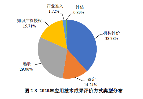應用技術成果以機構評價、驗收為主要評價方式,占比分別為38.38%和29.06%。知識產權授權方式占比為15.71%,占比較上年增加8.03個百分點;鑒定方式占比14.24%,較上年下降5.55個百分點(見圖2-8)。