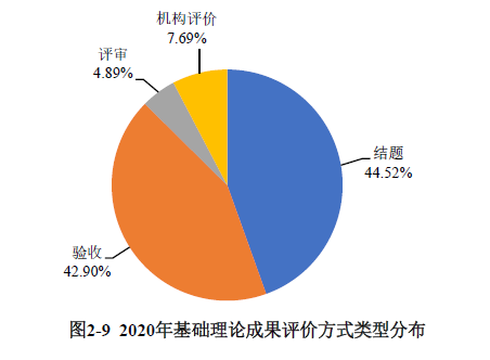 結題、驗收為基礎理論成果的主要評價方式。結題方式占比為44.52%,較上年下降了7.12個百分點;驗收方式所占比42.90%,較上年上升6.84個百分點;機構評價和評審方式所占比例偏低,分別為7.69%和4.89%(見圖2-9)。