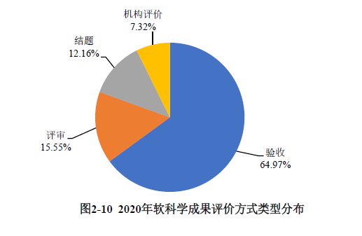 軟科學成果的評價方式以驗收為主,占比為64.97%,占比較上年增長了12.62個百分點。其次為評審和結題方式,占比分別為15.55%和12.16%,較上年分別降低了2.66個百分點和7.58個百分點(見圖2-10)。