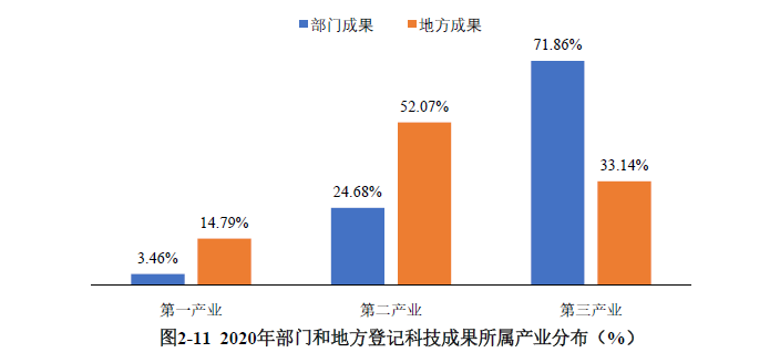 地方登記的科技成果主要應用于第二產業(yè)。按應用行業(yè)分類統計,第一產業(yè)(即農、林、牧、漁業(yè))占14.79%;第二產業(yè)(即采礦業(yè),制造業(yè),電力、熱力、燃氣及水的生產和供應業(yè),建筑業(yè))占52.07%;第三產業(yè)(即除第一、二產業(yè)外的其他行業(yè))的比例達到33.14%(見圖2-11)。 部門登記的科技成果主要應用于第三產業(yè),占比為71.86%(見圖2-11)。