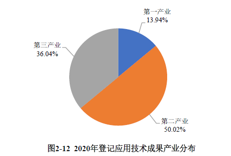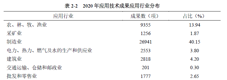從應用技術成果的行業(yè)分布看,2020年登記的應用技術成果主要集中在制造業(yè),農、林、牧、漁業(yè),衛(wèi)生和社會工作三個領域,占比分別為40.15%、13.94%和11.20%(見表2-2)。