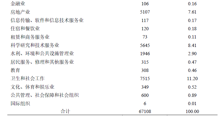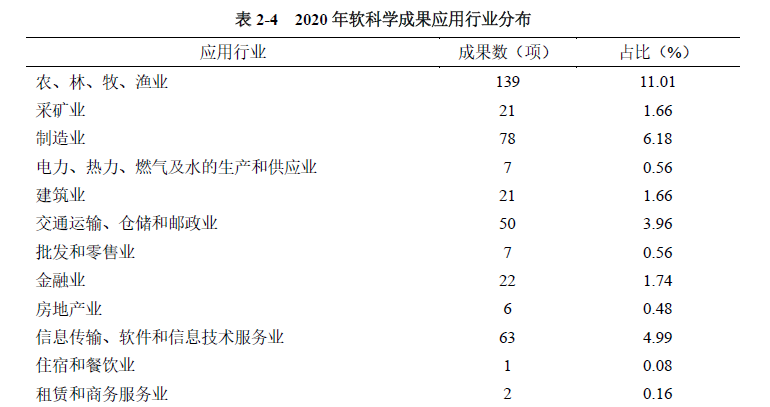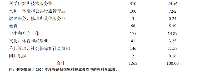 軟科學成果主要應用于科學研究和技術服務業(yè),衛(wèi)生和社會工作,公共管理、社會保障和社會組織三個行業(yè),所占比例分別為24.56%、13.87%和11.57%(表2-4)。