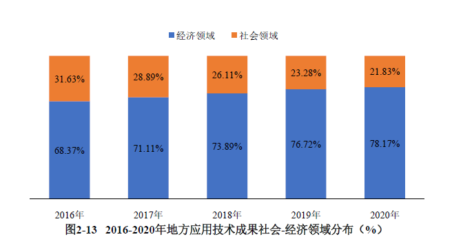 從應用技術成果的社會和經濟領域分布看,2020年地方應用技術成果在社會領域和經濟領域的比例分別為21.83%和78.17%,明顯聚焦在經濟領域,且所占比例逐年增加(見圖2-13)。