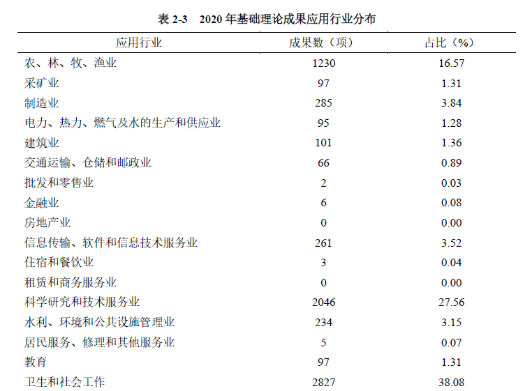 基礎理論成果主要應用于衛(wèi)生和社會工作,科學研究和技術服務業(yè),農、林、牧、漁業(yè)三個領域,占比分別為38.08%、27.56%和16.57%(見表2-3)。