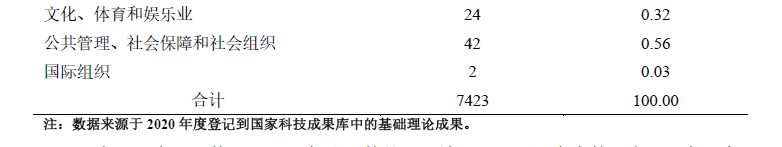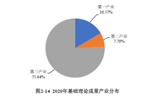 按產業(yè)分布進行統計,2020年登記的基礎理論成果主要分布在第三產業(yè),占比為75.64%;第二產業(yè)占比較低,僅為7.79%(見圖2-14)。