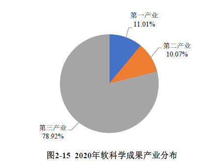 按產業(yè)分布進行統計,2020年登記的軟科學成果主要分布在第三產業(yè),占比為78.92%;第一產業(yè)和第二產業(yè)比例相近,約為10%(見圖2-15)。