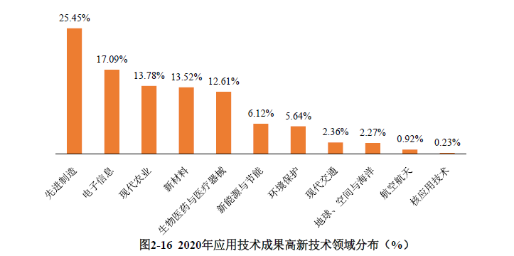2020年登記的應用技術成果中,高新技術領域科技成果達到42719項,占應用技術成果總量的63.66%。應用技術成果主要分布在五大高新技術領域,依次是先進制造(25.45%)、電子信息(17.09%)、現代農業(yè)(13.78%)、新材料(13.52%)和生物醫(yī)藥與醫(yī)療器械(12.61%)。五大領域科技成果占高新技術領域科技成果總量的82.45%(見圖2-16)。