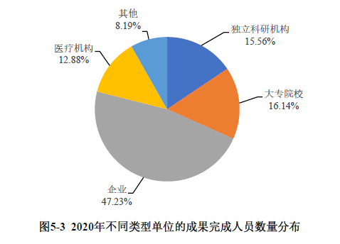企業(yè)科技人員是科學(xué)技術(shù)研究開發(fā)的主體。從單位類型看,企業(yè)科技成果研究人員為226120人次,占總?cè)舜蔚?7.23%;大專院校研究人員為77268人次,占比為16.14%;獨立科研機構(gòu)和醫(yī)療機構(gòu)成果完成人員分別為74533人次和61677人次,分別占15.56%和12.88%(見圖5-3)。