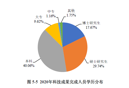 科技成果完成人中,博士研究生為84603人次,占總?cè)舜蔚?7.67%;碩士研究生為142408人次,占29.74%;大學(xué)本科為191791人次,占40.06%;本科以下學(xué)歷人員占比不高,與上年基本持平(見圖5-5)。