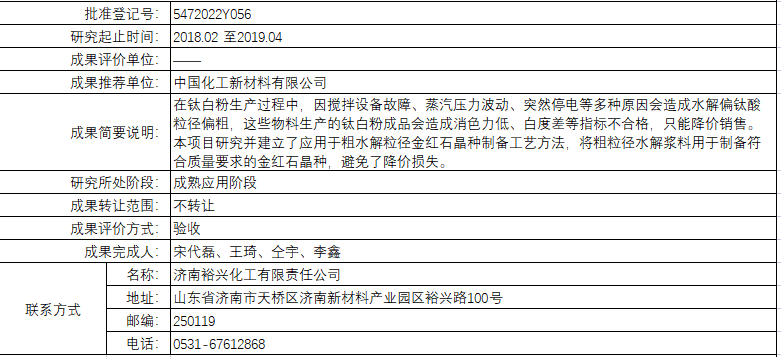 根據(jù)中國中化控股有限責任公司科技成果登記管理辦法,按照科技成果管理程序,現(xiàn)將中國中化控股有限責任公司登記的成果予以公告。對公告上登記的科技成果內容持有異議者,可與中國中化控股有限責任公司科技成果登記中心聯(lián)系。其管理有效期(自公告之日起)為期7天。