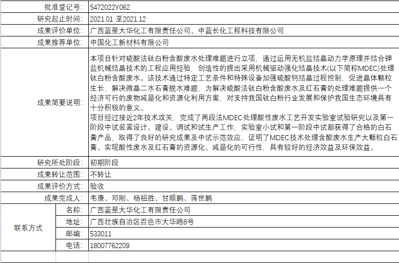 根據(jù)中國中化控股有限責(zé)任公司科技成果登記管理辦法,按照科技成果管理程序,現(xiàn)將中國中化控股有限責(zé)任公司登記的成果予以公告。對(duì)公告上登記的科技成果內(nèi)容持有異議者,可與中國中化控股有限責(zé)任公司科技成果登記中心聯(lián)系。其管理有效期(自公告之日起)為期7天。