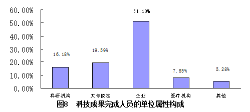2021年度登記的科技成果涉及到的完成人員共8943人次。以單位屬性看,企業(yè)和大專院校的科技人員最多。其中,企業(yè)科技人員4570人次,占51.10%;大專院校人員1752人,占19.59%;醫(yī)療機構702人,占7.85%;科研機構科技人員1447人,占16.18%;其他472人,占5.28%(見圖8)。