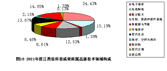 2021年度江西省登記的1208項應用技術成果中,有790項屬高新技術領域,占登記的科技成果總數(shù)的64.86%。其中,電子信息193項,占所登記的高新技術領域成果總量的24.43%;先進制造120項,占15.19%;航空航天11項,占1.39%;現(xiàn)代交通11項,占1.39%;生物醫(yī)藥和醫(yī)療器械99項,占12.53%;新材料111項,占14.05%;新能源與節(jié)能68項,占8.61%;環(huán)境保護51項,占6.46%;地球、空間與海洋17項,占2.15%;核應用技術1項,占0.13%;現(xiàn)代農業(yè)108項,占13.67%。電子信息領域在全省高新技術領域中所占比例最高,其次先進制造和新材料也都占有較大比例( 見圖10)。