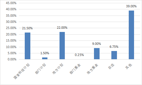 2021年度登記的科技成果仍以各級(jí)財(cái)政支持的各類計(jì)劃項(xiàng)目成果為主,來源于各級(jí)科技計(jì)劃項(xiàng)目的成果180項(xiàng),占成果登記總數(shù)的45.00%;部門基金1項(xiàng),占0.25%;地方基金36項(xiàng),占9.00%;自選項(xiàng)目27項(xiàng),占6.75%;其他項(xiàng)目156項(xiàng),占39.00%。各級(jí)計(jì)劃項(xiàng)目中,國家科技計(jì)劃項(xiàng)目86項(xiàng),占成果登記總數(shù)的21.50%;地方計(jì)劃88項(xiàng),占22.00%;部門計(jì)劃6項(xiàng),占1.50%。國家科技計(jì)劃項(xiàng)目成果中,自然科學(xué)基金項(xiàng)目79項(xiàng),占成果登記總數(shù)的19.75%,基地和人才專項(xiàng)2項(xiàng),占0.50%。見圖1: