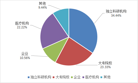 據(jù)統(tǒng)計(jì),各級(jí)科技計(jì)劃項(xiàng)目成果完成單位分布主要集中在獨(dú)立科研機(jī)構(gòu)、大專院校、醫(yī)療機(jī)構(gòu)、企業(yè),其中,獨(dú)立科研機(jī)構(gòu)完成的成果62項(xiàng),占各級(jí)科技計(jì)劃成果總數(shù)的34.44%;大專院校完成的成果42項(xiàng),占23.33%;醫(yī)療機(jī)構(gòu)完成的成果40項(xiàng),占22.22%;企業(yè)完成的成果19項(xiàng),占成果登記總數(shù)的10.56%;其他單位完成成果17項(xiàng),占9.44%。見圖2: