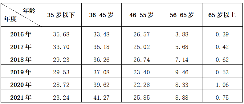 表1:2016-2021年科技成果完成人員年齡結(jié)構(gòu)(%)