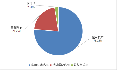 在2021年度登記的科技成果中,應(yīng)用技術(shù)成果305項(xiàng),占登記成果總數(shù)的76.25%;基礎(chǔ)理論成果85項(xiàng),占21.25%;軟科學(xué)成果10項(xiàng),占2.50%;應(yīng)用技術(shù)類成果數(shù)量遠(yuǎn)遠(yuǎn)超過另外兩類成果。見圖6: