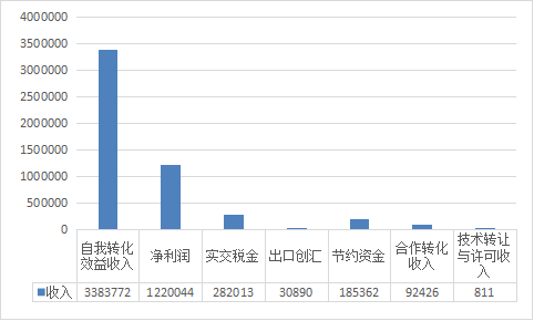 (1)2021年登記的科技成果自我轉(zhuǎn)化效益合計(jì)收入338.38億元,其中,凈利潤122.00億元,占自我轉(zhuǎn)化總收入的36.06%;實(shí)交稅金28.20億元,占8.33%;出口創(chuàng)匯3.09億元,占0.91%;節(jié)約資金18.54億元,占5.48%。合作轉(zhuǎn)化收入9.24億元,技術(shù)轉(zhuǎn)讓與許可收入收入811.00萬元。如圖7: