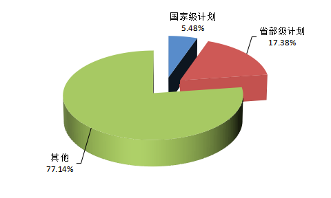 2021年度河南省登記的2992項(xiàng)成果中,來自國家級(jí)計(jì)劃項(xiàng)目的有164項(xiàng),占5.48%,來自省部級(jí)計(jì)劃項(xiàng)目的520項(xiàng),占17.38%,其他類項(xiàng)目2308項(xiàng),占77.14%。