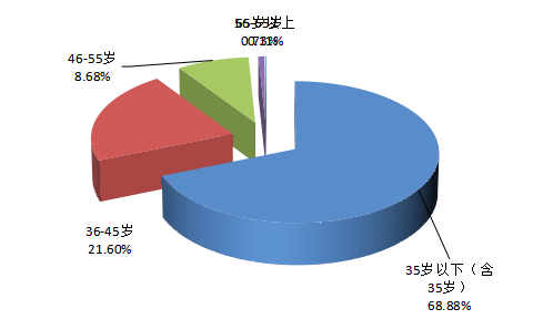 項(xiàng)目完成人中35歲以下人員16809人,占68.88%;36-45歲人員5272人,占21.60%;46-55歲人員2118人,占8.68%;56-65歲人員179人,占0.73%;65歲以上人員27人,占0.11%。