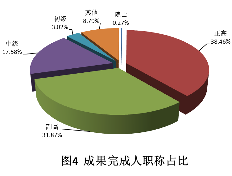 2021年登記的科技成果涉及完成人共364人,平均每個項目有約25個人參與。從年齡結(jié)構(gòu)上來看(圖2),以36-45歲的中青年為主要科研力量,共144人,占比總?cè)藬?shù)的39.6%;小于35歲(含35歲)的成果完成人為53人,占比總?cè)藬?shù)的14.6%;46-55歲的成果完成人為88人,占比總?cè)藬?shù)的24.2%。從學(xué)歷構(gòu)成看(圖3),以博士研究生學(xué)歷為主,共有175人,占比達到48.08%,其次是碩士研究生和本科學(xué)歷,占比分別為24.73%和21.70%。從職稱構(gòu)成看(圖4),高級職稱人員最多,共有256人,占完成人總數(shù)的70.33%,其中正高級人員占比38.46%、副高級人員占比31.87%;中級從業(yè)科技人員占比完成人總數(shù)的17.58%,多數(shù)為35歲以下的青年科技人員??傮w來看,成果研究人員本科及以上學(xué)歷人員占比達94.51%,中高級職稱人員占比成果完成人的87.91%,科研隊伍結(jié)構(gòu)日趨合理、科技支撐能力建設(shè)日益加強。