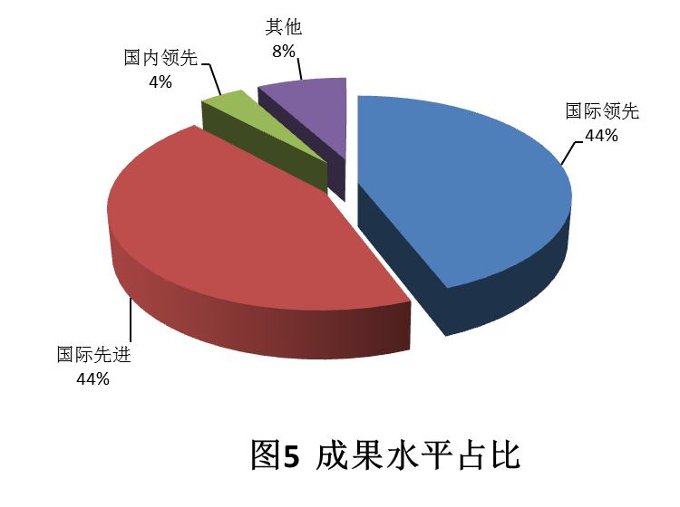 2021年登記的科技成果中,原始性創(chuàng)新22項,國外引進消化吸收創(chuàng)新2項,國內(nèi)技術(shù)二次開發(fā)1項。從成果水平來看(圖5),國際領(lǐng)先項目11項,占比登記總數(shù)的44%,國際先進項目11項,占比登記總數(shù)的44%,國際水平成果整體占比登記成果總數(shù)的88%。2021年登記的科技成果中,14個項目屬于高新技術(shù)領(lǐng)域成果,以現(xiàn)代農(nóng)業(yè)領(lǐng)域為主,達到13項,占比高新技術(shù)領(lǐng)域成果的92.09%,占比登記成果總數(shù)的52%。
