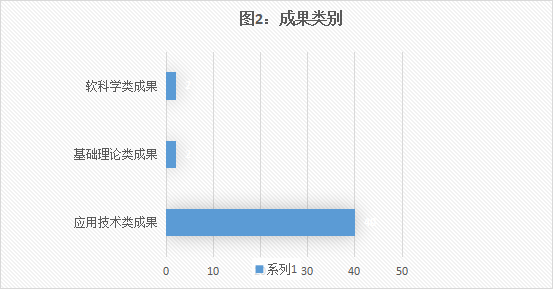 本年度新增應(yīng)用技術(shù)類(lèi)成果40項(xiàng),基礎(chǔ)理論類(lèi)成果2項(xiàng),軟科學(xué)類(lèi)成果2項(xiàng)(如圖2所示),其中基礎(chǔ)理論類(lèi)成果和軟科學(xué)類(lèi)成果占新增總成果的比例由去年的各占1.14%提高到各占4.5%。