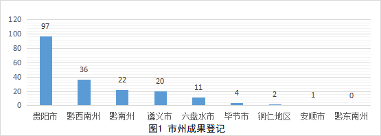 成果登記以省會貴陽市為主,有97項,比上年減少15項,同比下降13.39%,占比為50.26%;六盤水市有11項,比上年增加6項,同比增長120.00%;遵義市有20項,比上年減少2項,同比下降9.09%;安順市有1項,比上年減少1項,同比下降50.00%;畢節(jié)市有4項,比上年增加4項;銅仁市有2項,比上年減少7項,同比下降77.78%;黔西南自治州有36項,比上年減少2項,同比下降5.26%;黔東南自治州有2項,比上年減少2項,同比下降100.00%;黔南自治州有22項,比上年增加13項,同比增長144.44%。