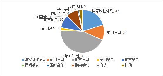 國家科技計劃有39項,比上年減少26項,同比下降40.00%;部門計劃有22項,比上年增加5項,同比增長29.41%;地方計劃有85項,比上年增加7項,同比增長8.97%;除此之外,還有部門基金4項;地方基金9項;橫向委托17項;自選2項;其他5項。